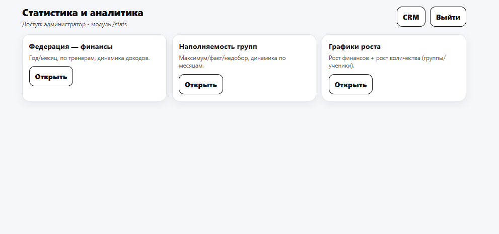 Эта страница показывает CRM “как она выглядит” и какой путь проходит тренер/админ. Реальные модули.